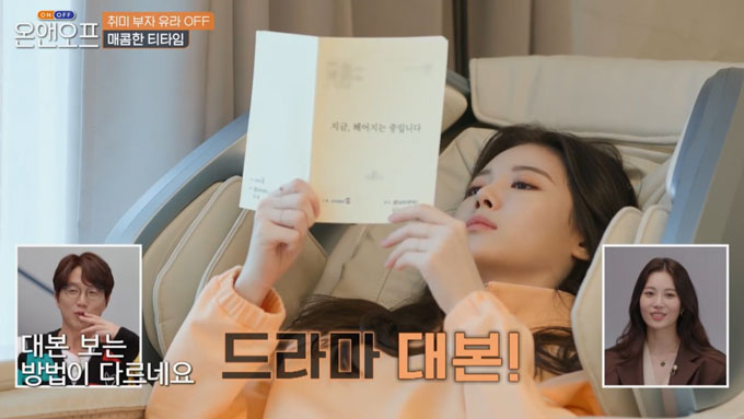 유라는 아침부터 안마의자에 앉아 하루를 시작했습니다. 안마의자를 올해부터 갑자기 찾게 되더라며 요즘은 2시간씩 한다고 밝히며 웃음을 자아냈습니다. 그리고 유라는 안마의자에서 최근 캐스팅된 새 드라마 <지금 헤어지는 중입니다> 대본을 봤습니다.